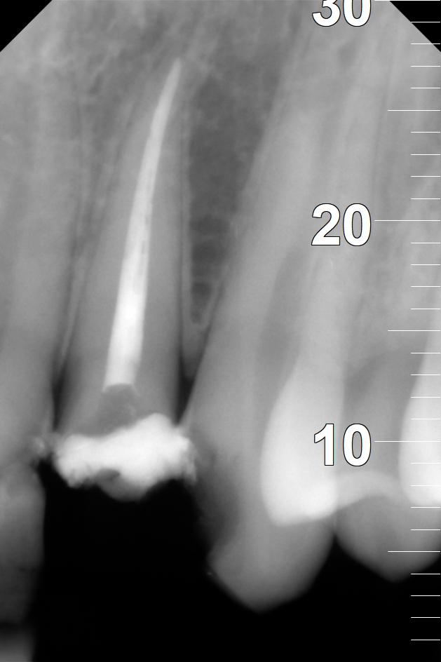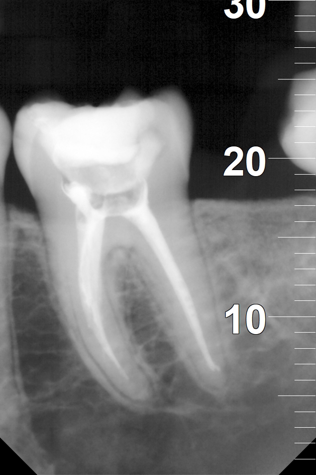 Na nasledujúcich RTG snímkoch sú dobre viditeľné biele výplne ošetrených koreňových kanálikov. Biela farba na snímkoch je spôsobená tým, že výplňový materiál je zámerne RTG kontrastný, aby bolo ľahko možné identifikovať výplne koreňových kanálikov.
